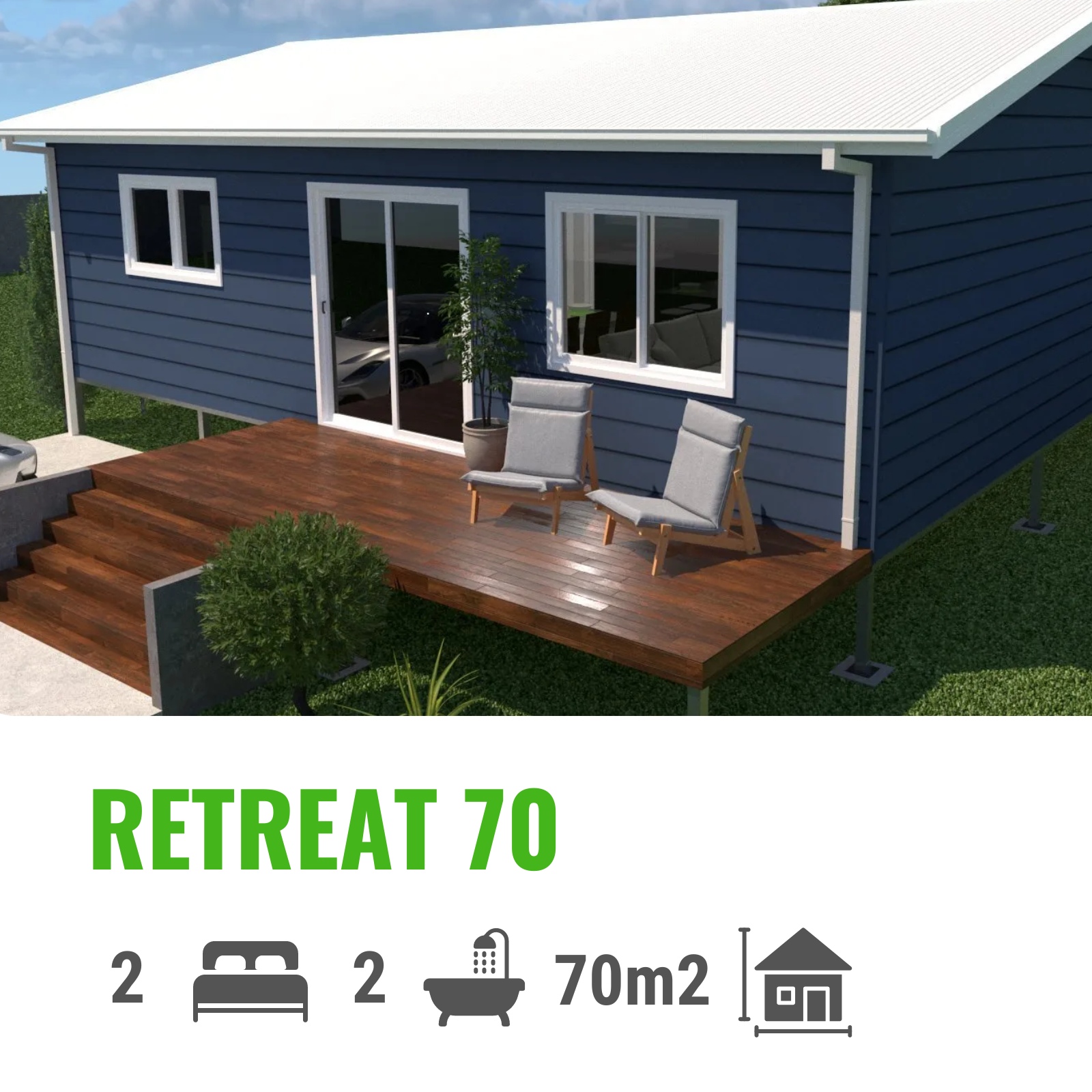 The Retreat 70 design is a space efficient design and would be perfect for a granny flat on an existing property or a stand alone house. Featuring open plan kitchen and walk in robe in master. This design has lots of street appeal with beautiful front porch.